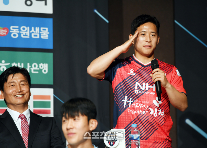 김천상무 김현욱 26일 중구 소공동 더플라자호텔에서 열린 하나은행K리그 2024 개막 미디어데이에서 올시즌에 임하는 출사표를 던지고 있다. 2024.02.26. 소공동 | 강영조 기자 kanjo@sportsseoul.com