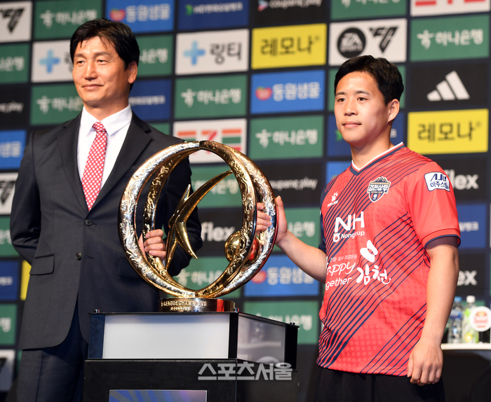 김천상무 정정용 감독과 김현욱이 26일 중구 소공동 더플라자호텔에서 열린 하나은행K리그 2024 개막 미디어데이에서 트로피를 잡고 포토타임을 갖고 있다. 2024.02.26. 소공동 | 강영조 기자 kanjo@sportsseoul.com