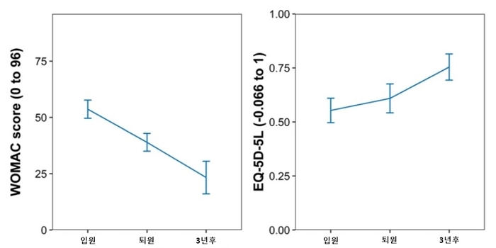 연구팀은 평가 지표로 △숫자평가척도(NRS) △골관절염지수(WOMAC) △삶의 질 척도(EQ-5D) 등을 활용했다. NRS(0~10점)는 숫자가 클수록 통증이 심함을 나타내며, WOMAC(0~96점)은 무릎 통증과 뻣뻣함 등으로 겪는 활동의 어려움을 평가하는 척도로, 점수가 높을수록 일상생활이 힘들다는 것을 의미한다. 또한 삶의 질 척도를 나타내는 EQ-5D(-0.066~1점)는 1에 근접할수록 삶의 질과 건강 상태가 이상적임을 뜻한다.