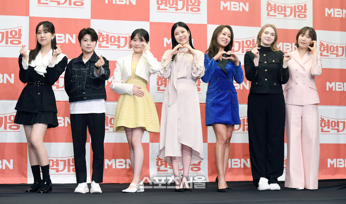 26일 서울 마포구 스탠포드호텔에서 진행된 MBN ‘현역가왕’ 기자간담회에서 ‘TOP 7’에 오른 가수들이 취재진을 향해 포즈를 취하고 있다. 왼쪽부터 전유진, 마이진, 김다현, 린, 박혜신, 마리아, 별사랑. 2024. 2. 26. 박진업 기자 upandup@sportsseoul.com
