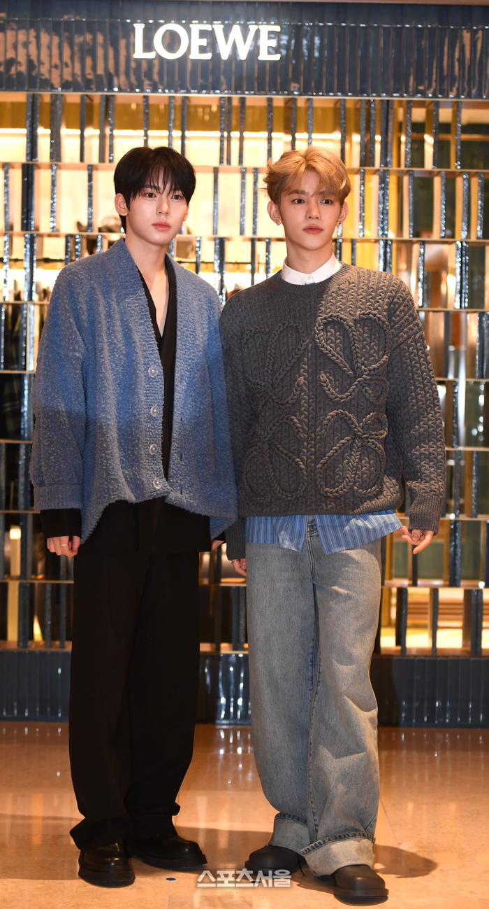제로베이스원 한유진(왼쪽)과 장하오가 26일 로에베 신세계백화점 강남점 남성 스토어 오픈 기념 포토콜 행사에 참석해 포즈를 취하고 있다. 2024. 2. 26. 최승섭기자 thunder@sportsseoul.com