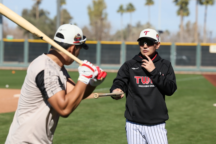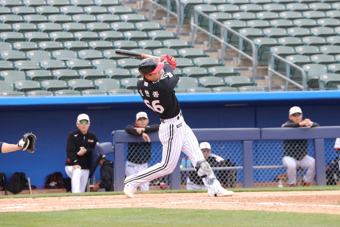 [스포츠서울 | 투산=윤세호 기자] 신인 드래프트 지명 당시 그렸던 그림이 빠르게 현실로 다가온다. 공수주가 두루 능한 5툴 플레이어로 기대한 신인 외야수 김현종(20)이 올해 첫 두 번의 실전에서 돋보이는 활약을 펼쳤다. 첫 경기 청백전 3루타에 이어 두 번째 경기 NC전에서는 홈런과 적시타, 그리고 도루까지 마음껏 그라운드를 휘저었다. 사령탑 또한 미소를 감추지 않았다.