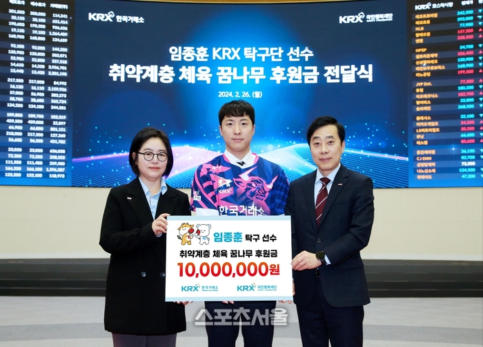 한국거래소(KRX·이사장 정은보)는 27일 보도자료를 통해 “임종훈 선수가 경제적으로 어려운 취약계층 초중고 탁구선수를 위해 써달라며 KRX국민행복재단에 기부했다”며 장학금과 장비지원 등을 위해 전액 사용될 예정이라고 밝혔다.