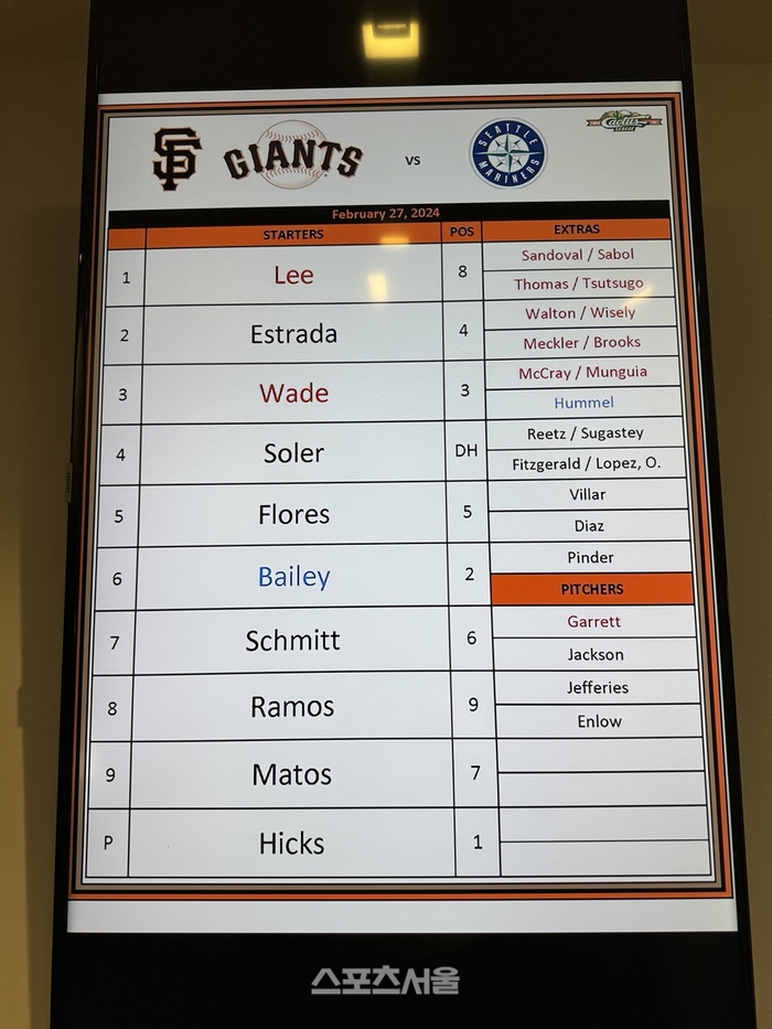 이날 샌프란시스코는 이정후(중견수)~에스트라다(2루수)~웨이드(1루수)~솔레어(지명타자)~플로레스(3루수)~베일리(포수)~슈미트(유격수)~라모스(우익수)~마토스(좌익수)로 라인업을 짰다. 선발 투수는 오른손 파이어볼러 조던 힉스다. bng7@sportsseoul.com