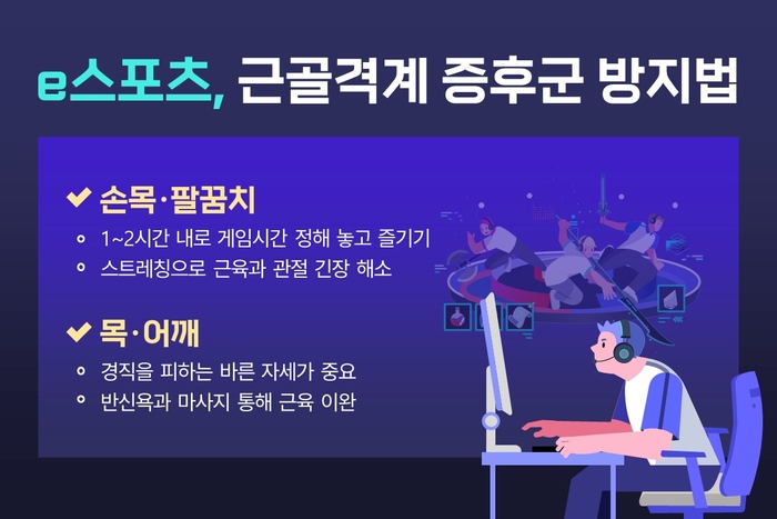 이 같은 근골격계 질환을 예방하기 위해서는 게임 시간을 1~2시간 내로 정해놓고 하는 것이 중요하다. 또 게임 중간중간 손목을 가볍게 흔들거나 팔꿈치를 돌리면서 근육과 관절의 긴장을 해소해 주는 것이 좋다.