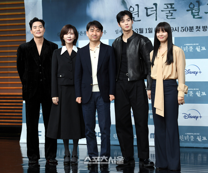 김강우, 김남주, 이승영 감독, 차은우, 임세미(왼쪽부터)가 29일 서울 상암동 MBC에서 열린 새 금토드라마 ‘원더풀 월드’ 제작발표회에서 포토타임을 갖고 있다. ‘원더풀 월드’는 아들을 죽인 살인범을 직접 처단한 은수현(김남주)이 그날에 얽힌 미스터리한 비밀을 파헤쳐 가는 휴먼 미스터리 내용이다. ‘원더풀 월드’는 오는 3월 1일 밤 9시 50분에 첫방송되며, 디즈니+를 통해서도 시청할 수 있다. 2024. 2. 29. 최승섭기자 thunder@sportsseoul.com