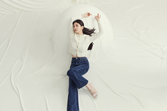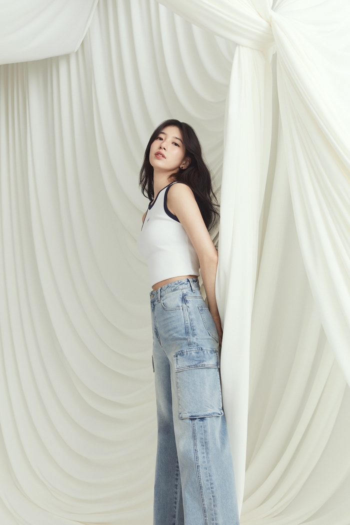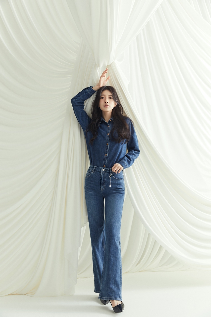 ‘블랙 라벨’ 컬렉션은 고급스러운 소재와 군더더기 없이 깔끔하게 허리선을 잡아주는 클린 스티치 디테일, 다리를 길어 보이게 해주는 게스 특유의 패턴 기술이 모두 집약된 프리미엄 데님 팬츠 컬렉션으로, 화보 속 수지의 몸매 라인을 더욱 돋보이게 만들어 주고 있다.