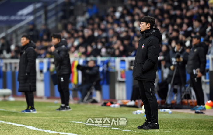 수원FC 김은중 감독이 2일 인천축구전용경기장에서 열린 하나은행 K리그1 인천 유나이티드와 경기에서 선수들의 플레이를 지켜보고 있다. 김은중 감독은 사령탑 데뷔전인 인천전에서 이승우의 결승골로 1-0 승리를 거뒀다. 2024. 3. 2. 인천 | 박진업 기자 upandup@sportsseoul.com