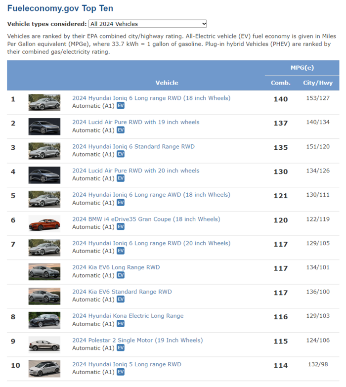 아이오닉 6뿐 아니라 기아 EV6 롱레인지·스탠더드 후륜모델(117MPGe)도 공동 7위, 현대 코나 일렉트릭 롱레인지(116MPGe)은 8위, 현대 아이오닉 5 롱레인지 후륜모델(114MPGe)은 10위에 자리했다.