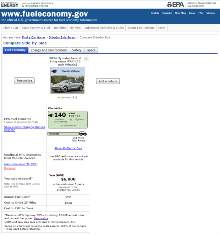 최근 미국 에너지부·환경보호청(EPA)이 공동 운영하는 연료절약 정보 사이트 ‘퓨얼이코노미(Fueleconomy.gov)’에 따르면 아이오닉 6 롱레인지 후륜모델(18인치휠·복합연비140MPGe)이 ‘최고 연료소비효율 차’에 등극했다.