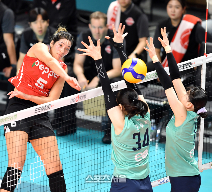 페퍼 야스민이 3일 장충체육관에서 열린 2023-2024 V리그 여자부 GS칼텍스와 페퍼저축은행의 경기에서 GS 이중블로킹에 강타공격을 하고 있다. 2024.3.3. 장충 | 강영조 기자 kanjo@sportsseoul.com