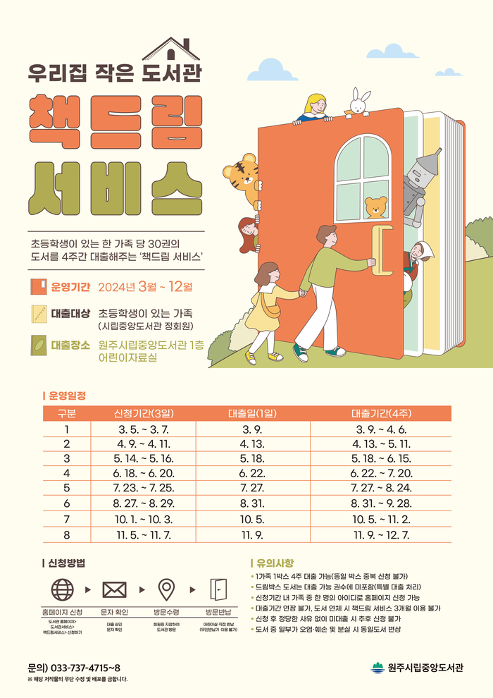 원주시립중앙도서관 홈페이지에서 신청 후 지정된 날짜에 어린이자료실을 방문해 대출하면 된다.