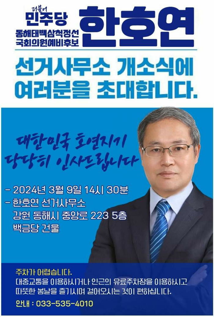 [스포츠서울ㅣ김기원기자] 제22대 국회의원선거 더불어민주당 강원특별자치도 동해태백삼척정선 한호연 국회의원 예비후보가 오는 3월 9일 오후 2시30분 동해시 중앙로 223 백금당 건물 5층에 있는 선거사무소에서 개소식을 개최한다.