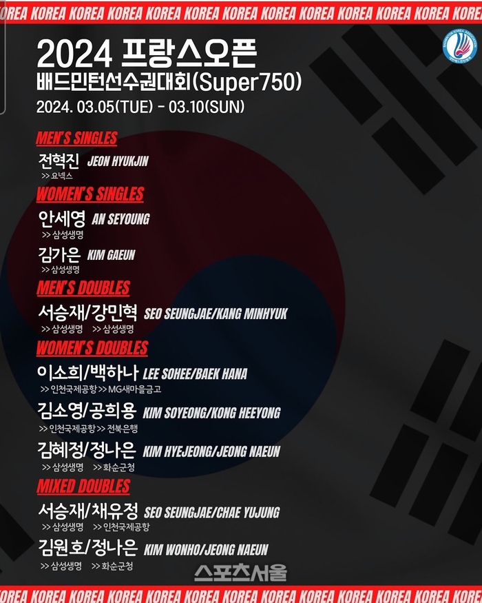 이번 프랑스오픈에는 남자복식 세계랭킹 2위 서승재-강민혁(이상 삼성생명), 여자복식 세계 2위 이소희(인천국제공항)-백하나(MG새마을금고), 4위 김소영(인천국제공항)-공희용(전북은행), 12위 김혜정(삼성생명)-정나은(화순군청) 등 한국 대표팀 간판스타들이 총출동한다.