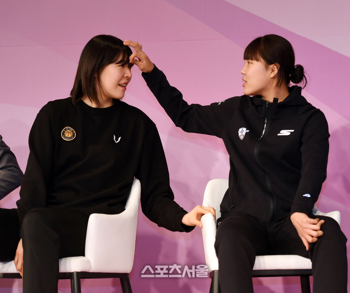 우리은행 박지현(오른쪽)이 5일 서울 상암동 스탠포드호텔코리아에서 열린 2023-2024 WKBL 포스트시즌 미디어데이에서 KB스타즈 박지수의 머리를 정리해 주고 있다. 2024. 3. 5. 최승섭기자 thunder@sportsseoul.com