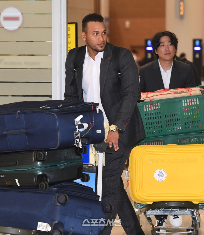롯데 자이언츠의 새 외국인 타자 빅터 레이예스가 5일 오후 일본 오키나와에서 스프링캠프를 마치고 인천국제공항을 통해 입국하고 있다. 2024. 3. 5. 인천국제공항 | 박진업 기자 upandup@sportsseoul.com