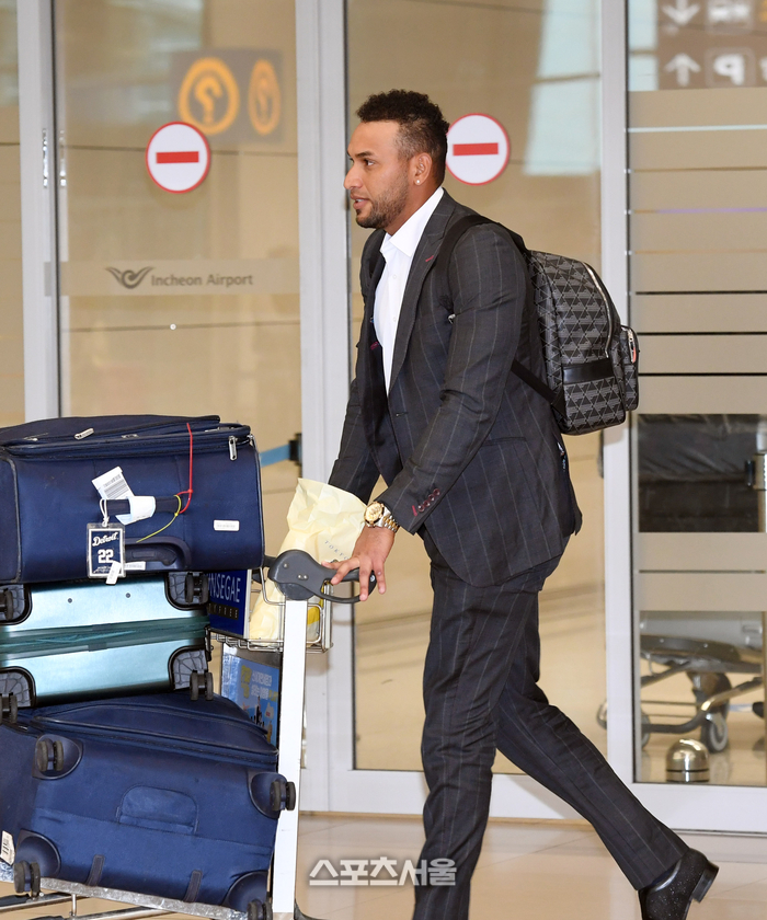 롯데 자이언츠의 새 외국인 타자 빅터 레이예스가 5일 오후 일본 오키나와에서 스프링캠프를 마치고 인천국제공항을 통해 입국하고 있다. 2024. 3. 5. 인천국제공항 | 박진업 기자 upandup@sportsseoul.com