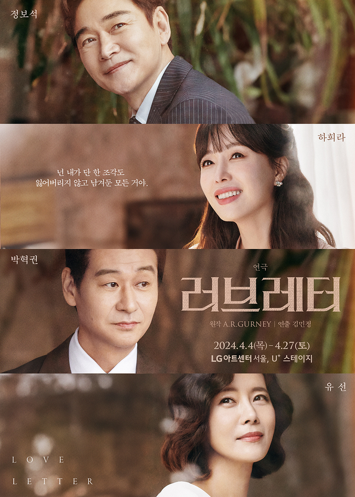 네 명의 명품 배우 정보석, 박혁권, 하희라, 유선이 출연하는 연극 ‘러브레터‘는 오는 4월 4일부터 4월 27일까지 LG아트센터 서울, U+ 스테이지에서 공연된다.