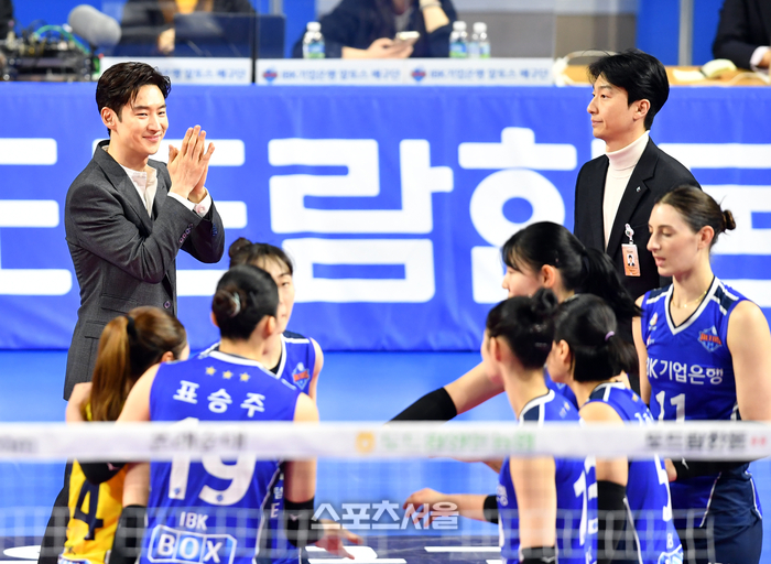 IBK 광고모델인 이제훈이 5일 화성실내체육관에서 열린 2023-2024 V리그 여자부 IBK기업은행과 흥국생명의 경기에서 시구를 한 후 선수들에 선전을 당부하고 있다. 2024.3.6. 화성 | 강영조 기자 kanjo@sportsseoul.com