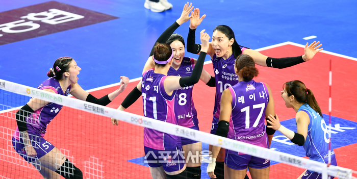 흥국 김연경이 5일 화성실내체육관에서 열린 2023-2024 V리그 여자부 IBK기업은행과 흥국생명의 경기에서 서브에이스를 기록한 후 동료들과 자축하고 있다. 2024.3.6. 화성 | 강영조 기자 kanjo@sportsseoul.com