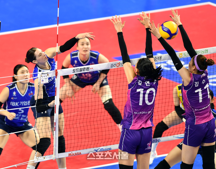 IBK 아베크롬비가 5일 화성실내체육관에서 열린 2023-2024 V리그 여자부 IBK기업은행과 흥국생명의 경기에서 흥국 이중블로킹에 강타를 터트리고 있다. 2024.3.6. 화성 | 강영조 기자 kanjo@sportsseoul.com