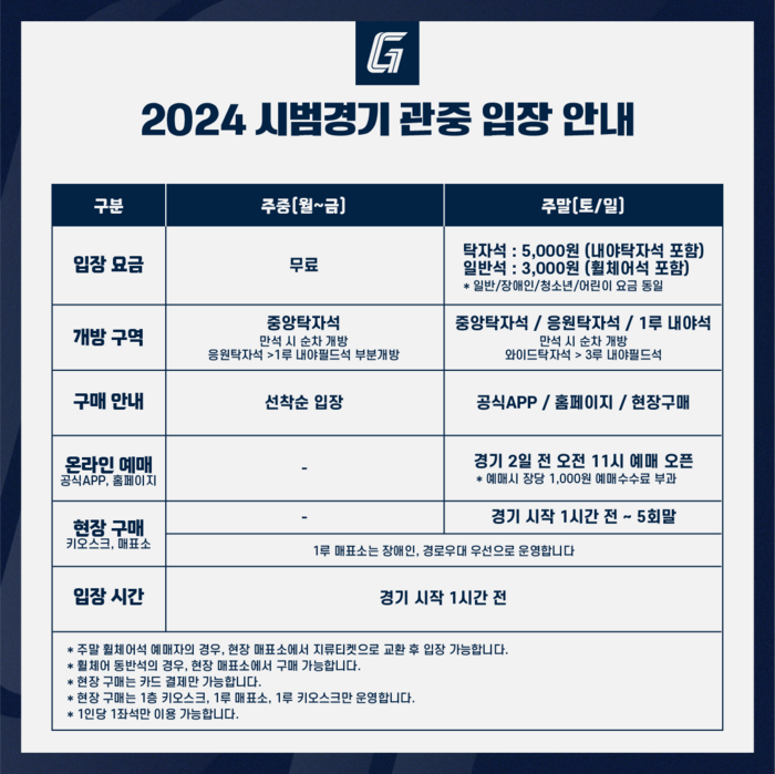 주말 경기에는 2024시즌 새롭게 구성된 응원단의 무대도 준비돼 있다. 현장 매표소는 장애인과 경로 우대를 우선으로 운영하며, 야구장 입장은 경기 시작 1시간 전부터 가능하다. 시범경기 일정 및 예매 안내는 구단 공식 홈페이지와 APP을 통하여 확인할 수 있다. socool@sportsseoul.com