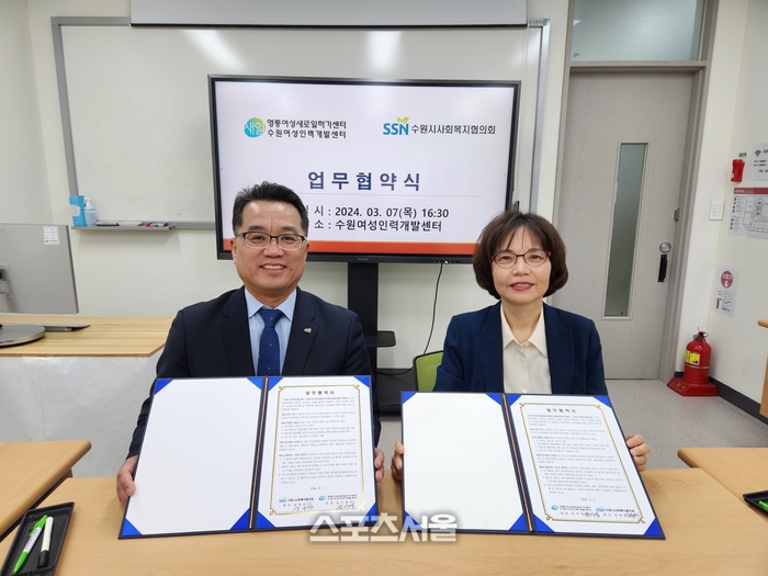 〔스포츠서울│수원=좌승훈기자〕수원여성인력개발센터는 사회복지증진과 경력 단절 여성의 고용 창출을 위해 7일 수원시사회복지협의회와 업무 협약식을 가졌다.