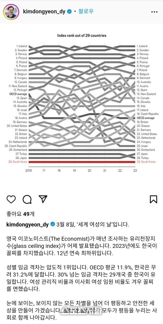 김 지사는 이날 자신의 SNS을 통해 “영국 이코노미스트(The Economist)가 매년 조사하는 유리천장지수(glass ceiling index)가 발표됐는데, 2023년에도 한국이 꼴찌를 차지하며 12년 연속 최하위다”면서 “성별 임금 격차도 압도적 1위로 OECE 평균이 11.9%인데 한국은 무려 31.2%로 30% 넘는 임금 격차는 29개국 중 한국이 유일하다”고 지적했다.