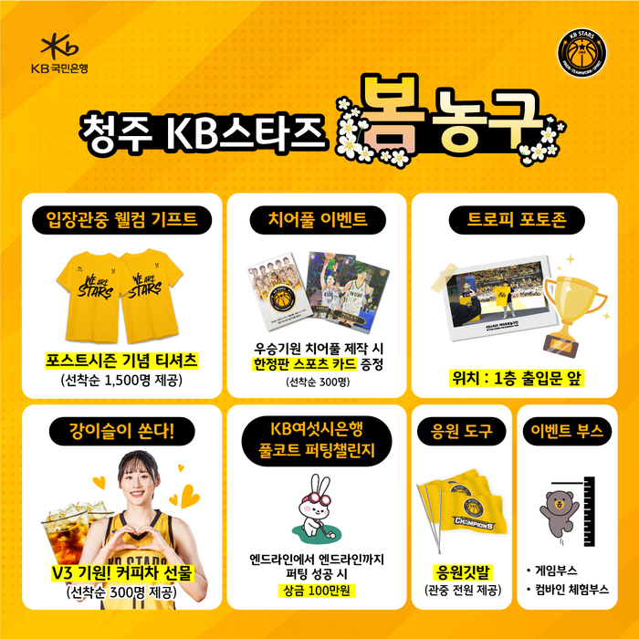 KB스타즈는 “2년만에 맞이하는 포스트시즌을 기념해 다양한 이벤트로 팬들에게 즐거움을 선사할 예정”이라며, “경기장에 오셔서 통합우승을 위한 첫 걸음을 함께 응원해달라”고 직관을 부탁했다. 이벤트 참여 방법 등 기타 자세한 내용은 구단 공식 SNS 등을 통해 확인할 수 있다. iaspire@sportsseoul.com