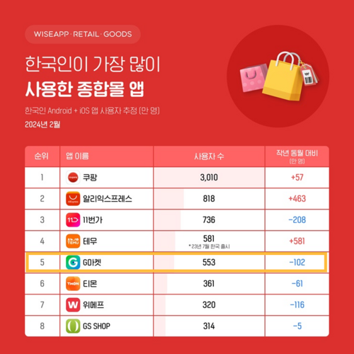 와이즈앱·리테일·굿즈에 따르면, 지난달 알리는 11번가(736만명)를 누르고 국내 쇼핑 앱 사용자 수 818만명으로 2위를 기록했다. 1위는 쿠팡으로 3010만명의 사용자를 기록 중이다. 신세계그룹 온라인 유통 계열사 G마켓은 5위에 그쳤다.