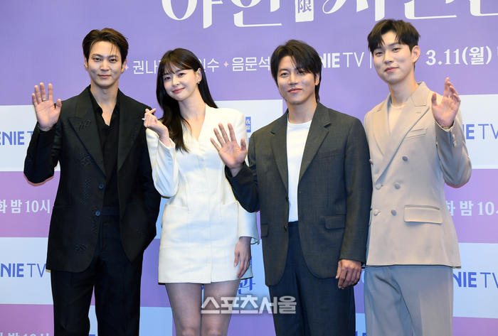 11일 서울 마포구 스탠포드호텔에서 진행된 지니TV 오리지널 ‘야한 사진관’ 제작발표회에서 출연 배우들이 취재진을 향해 포즈를 취하고 있다. 왼쪽부터 주원, 권나라, 음문석, 유인수. ‘야한 사진관’은 오직 죽은 자들을 위해 존재하는 귀객 전문 사진관의 까칠한 사진사와 열혈 변호사가 서늘한 밤 손님들과 생과 사를 오가며 펼치는 아찔하고도 기묘한 이야기를 그리고 있으며 배우 주원, 권나라, 유인수, 음문석 등이 출연하며 송현욱 감독이 연출했다. 2024. 3. 11. 박진업 기자 upandup@sportsseoul.com
