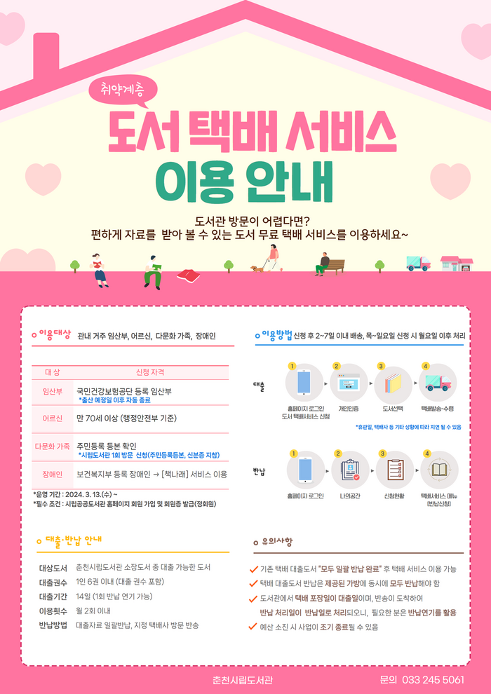 독서 취약계층의 이용 격차를 해소하고 편리한 독서환경을 제공하기 위해 기획했다. 이용 방법은 춘천시립도서관 회원가입 후 도서관 누리집에서 취약계층 도서 택배 서비스 메뉴에서 신청하면 된다.