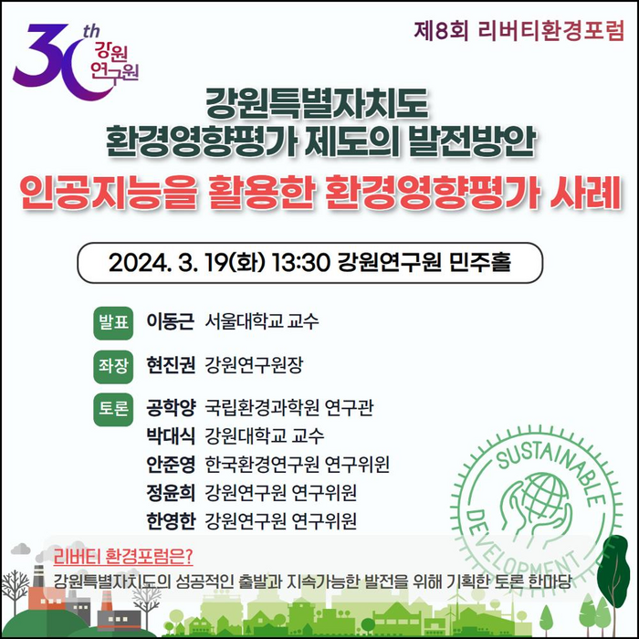 [스포츠서울ㅣ춘천=김기원기자] 강원연구원(원장 현진권)은 3월 14일(목) 14시 강원연구원 리버티홀에서 “강원특별법 3차 개정을 이해하자 : “해양산업과 항만배후단지”를 주제로 제7회 법포럼을 개최한다.