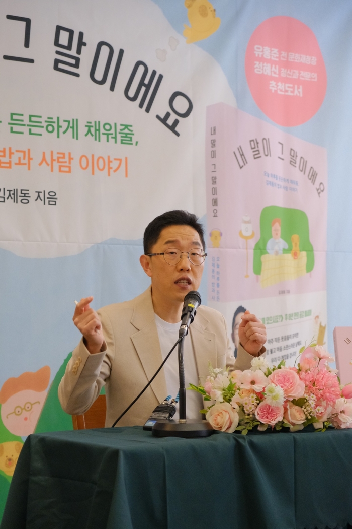 13일 중구 정동 프란치스코교육회관에서 열린 출간기념 기자간담회에서 만난 김제동은 책의 내용을 ‘밥과 사람의 이야기’라고 정의했다.