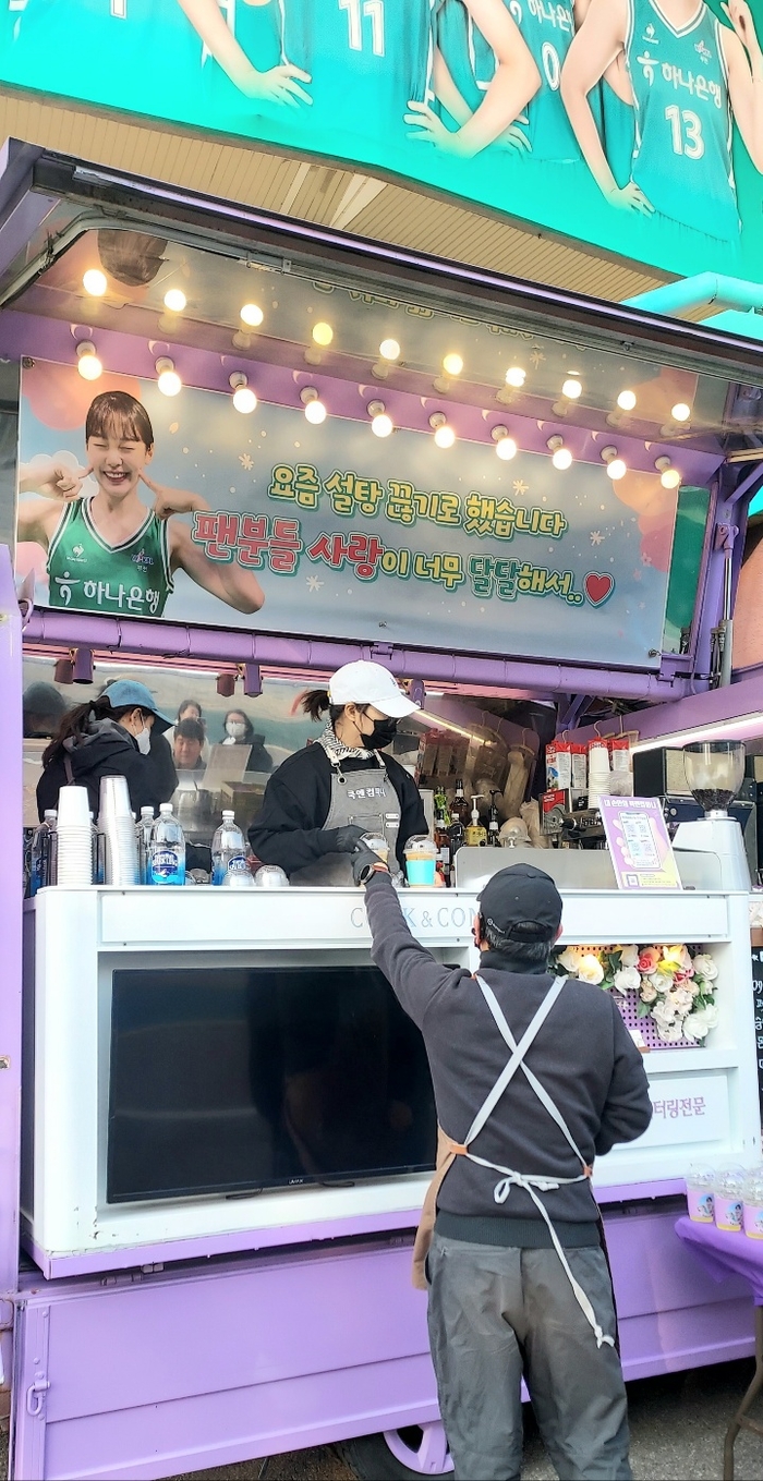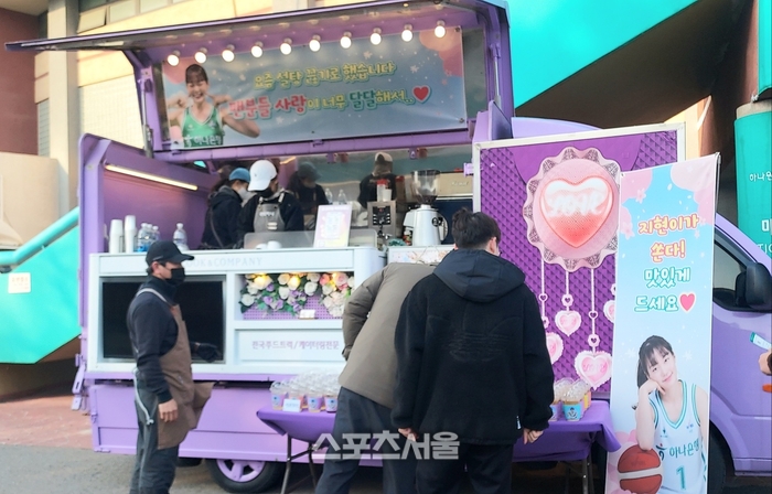 [스포츠서울 | 부천=이웅희 기자] 부천 하나원큐가 홈으로 돌아와 분위기 반전을 노리고 있는 가운데 하나원큐의 간판스타 신지현의 커피차가 현장 분위기를 끌어 올리고 있다.