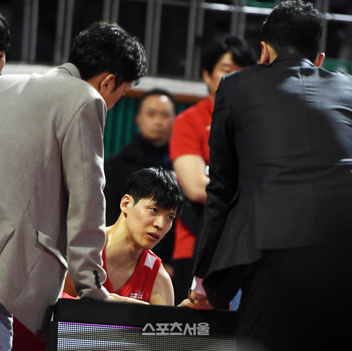 SK 김선형이 13일 잠실학생체육관에서 열린 2023-2024 프로농구 서울SK와 대구한국가스공사와의 경기 2쿼터 막판 부상을 당해 벤치를 지키고 있다. 2024.3.13. 잠실 | 강영조 기자 kanjo@sportsseoul.com