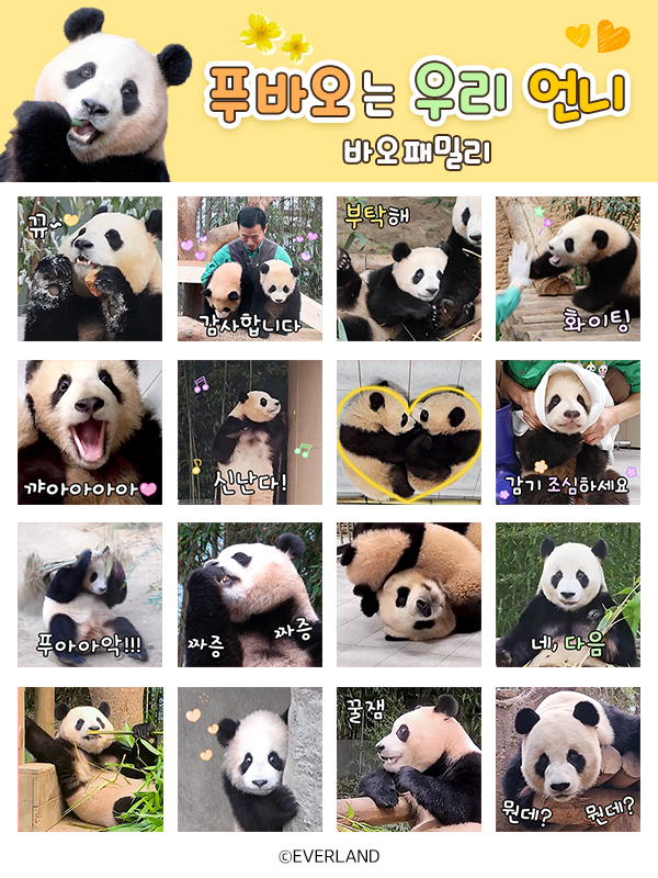 이번 이모티콘은 에버랜드 유튜브에 올라온 영상 중 팬들의 사랑을 많이 받은 영상에 재치 있는 표현이 가미된 24종으로 구성됐다. 맏언니 푸바오 10종을 비롯해, 쌍둥이 동생 루이바오와 후이바오 10종, 아빠 러바오 2종, 엄마 아이바오 2종 등이다. 쌍둥이 자매 루이바오, 후이바오가 등장한 건 이번이 처음이다.