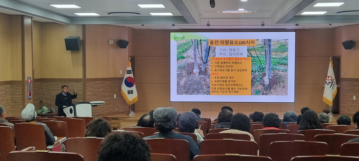 이번 일본전문가 초청 기술교육은 일본 현지 사과방제력에 따른 시기별 기후 대응 방안, 동해, 냉해 피해 방지와 동녹, 일소 피해 경감 방안 등 병해충 방제 기술 이론을 통해 고품질 사과 생산을 위해 실시 됐다.