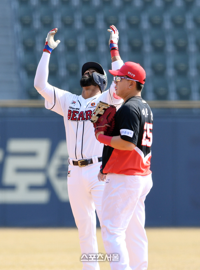 두산 베어스 라모스가 14일 잠실구장에서 열린 2024 KBO리그 KIA 타이거즈와 시범경기 4회말 1사 2-3루 상황에서 KIA 김대유을 상대로 2타점 2루타를 치고 세리머니를 하고 있다. 2024. 3. 14. 잠실 | 박진업 기자 upandup@sportsseoul.com