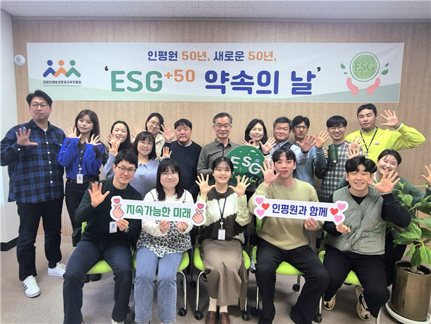 「환경·사회·투명경영(ESG)+50」은 강원인재육성평생교육진흥원(이하 인평원)의 슬로건인 ‘인평원 50년, 새로운 50년’에 따라, 지속가능한 미래 50년을 선도한다는 인평원만의 차별화된 환경·사회·투명경영(ESG) 브랜드이다.