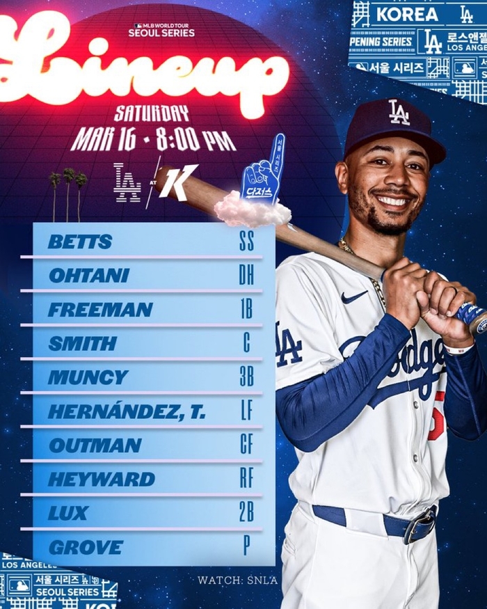 야수진은 베스트9에 가깝다. 무키 베츠(유격수)~오타니 쇼헤이(지명타자)~프레디 프리먼(1루수)~윌 스미스(포수)~맥스 먼시(3루수)~테오스카 에르난데스(좌익수)~제임스 아웃맨(중견수)~제이슨 헤이워드(우익수)~개빈 럭스(2루수)로 라인업을 짰다.