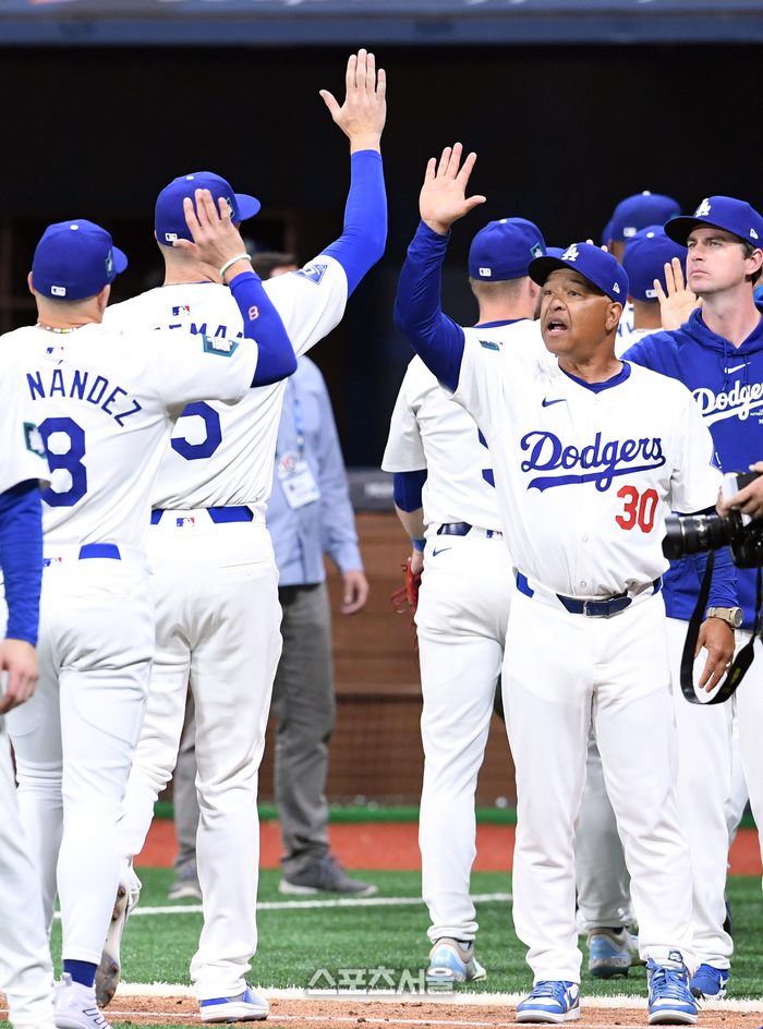 LA 다저스 데이브 로버츠 감독(오른쪽)이 17일 고척스카이돔에서 진행된 키움 히어로즈와 연습경기에서 키움에 14-3으로 승리한 뒤 선수들과 하이파이브를 나누고 있다. 2024. 3. 17. 고척 | 박진업 기자 upandup@sportsseoul.com
