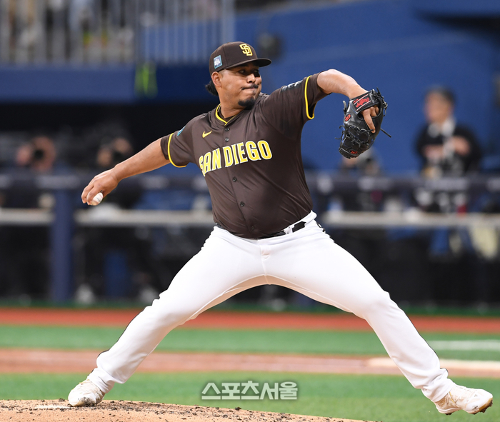 샌디에이고 파드리스 제레미아 에스트라다가 17일 고척스카이돔에서 열린 ‘메이저리그 월드투어 서울 시리즈 2024’ 팀 코리아와 스페셜 매치에 등판해 힘차게 공을 던지고 있다. 2024. 3. 17. 고척 | 박진업 기자 upandup@sportsseoul.com