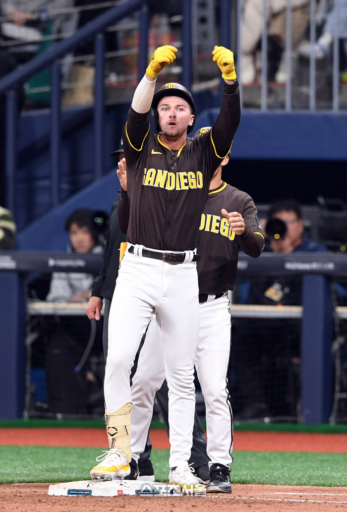 샌디에이고 파드리스 잭슨 메릴이 17일 고척스카이돔에서 열린 ‘메이저리그 월드투어 서울 시리즈 2024’ 팀 코리아와 스페셜 매치 4회말 안타를 친 뒤 세리머니를 하고 있다. 2024. 3. 17. 고척 | 박진업 기자 upandup@sportsseoul.com