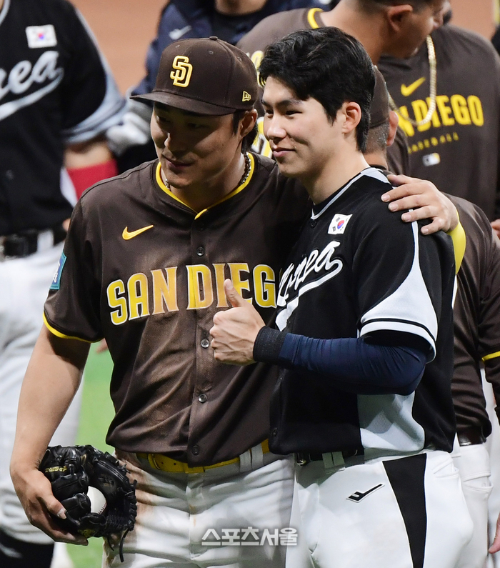 샌디에이고 파드리스 김하성(왼쪽)이 17일 고척스카이돔에서 열린 ‘메이저리그 월드투어 서울 시리즈 2024’ 팀 코리아와 스페셜 매치가 끝난 뒤 김혜성과 기념촬영을 하고 있다. 2024. 3. 17. 고척 | 박진업 기자 upandup@sportsseoul.com