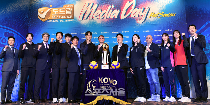 프로배구 포스트시즌 진출팀 감독과 대표선수들이 18일 서울 청담동 리베라호텔에서 열린 2023~2024 V-리그 포스트시즌 미디어데이에서 파이팅을 외치며 포즈를 취하고 있다. 2024. 3. 18. 최승섭기자 thunder@sportsseoul.com