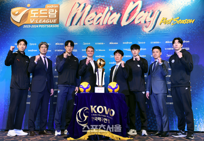 OK금융그룹 차지환, 오기노 마사지 감독, 대한항공 임동혁, 토미 틸리카이넨 감독, 우리카드 신영철 감도, 김지한, 현대캐피탈 진순기 감독대행, 허수봉(왼쪽부터)이 18일 서울 청담동 리베라호텔에서 열린 2023~2024 V-리그 포스트시즌 미디어데이에서 파이팅을 외치며 포즈를 취하고 있다. 2024. 3. 18. 최승섭기자 thunder@sportsseoul.com