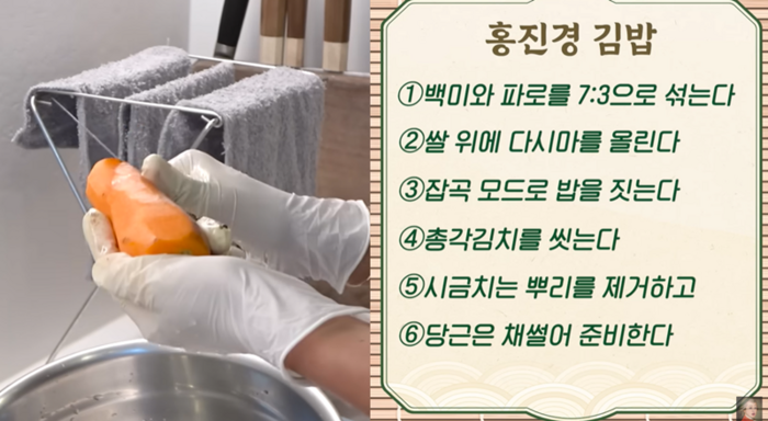 밥을 하는 것부터 김밥 재료로 어떤 걸 쓰는지 하나부터 열까지 다 소개하는 시간을 가졌다. 본격적으로 김밥을 말기 전 쌀을 씻으며 홍진경은 본인 “김밥엔 특급 비법이 있다”라고 말해 시청자들의 궁금증을 자아냈다.