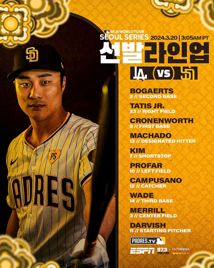 경기에 앞서 양 팀의 라인업이 나왔다. 샌디에이고는 잰더 보가츠(2루수)-페르난도 타티스 주니어(우익수)로 테이블 세터를 꾸렸다.