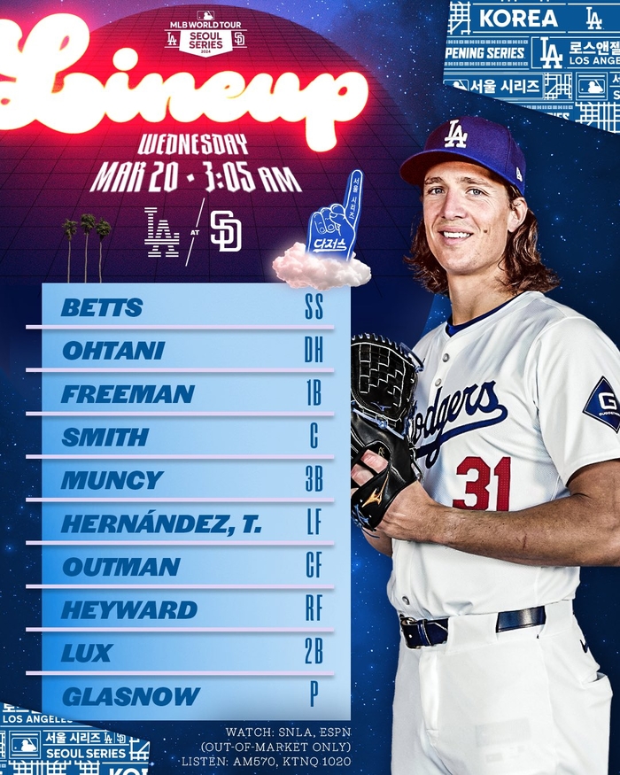 윌 스미스(포수)-맥스 먼시(3루수)가 4번과 5번으로 나서고, 하위에는 테오스카 에르난데스(좌익수)-제임스 아웃맨(중견수)-제이슨 헤이워드(우익수)-개빈 럭스(2루수)가 출전한다. 선발투수는 타일러 글래스나우다.